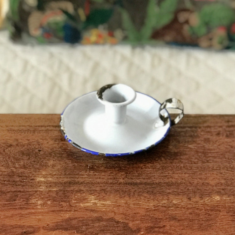 / Bougeoir à main dit rat de cave en tôle émaillée blanche liserés bleu