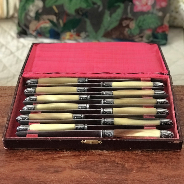 / Coffret ménagère de 12 couteaux manche en corne, détails en métal argenté