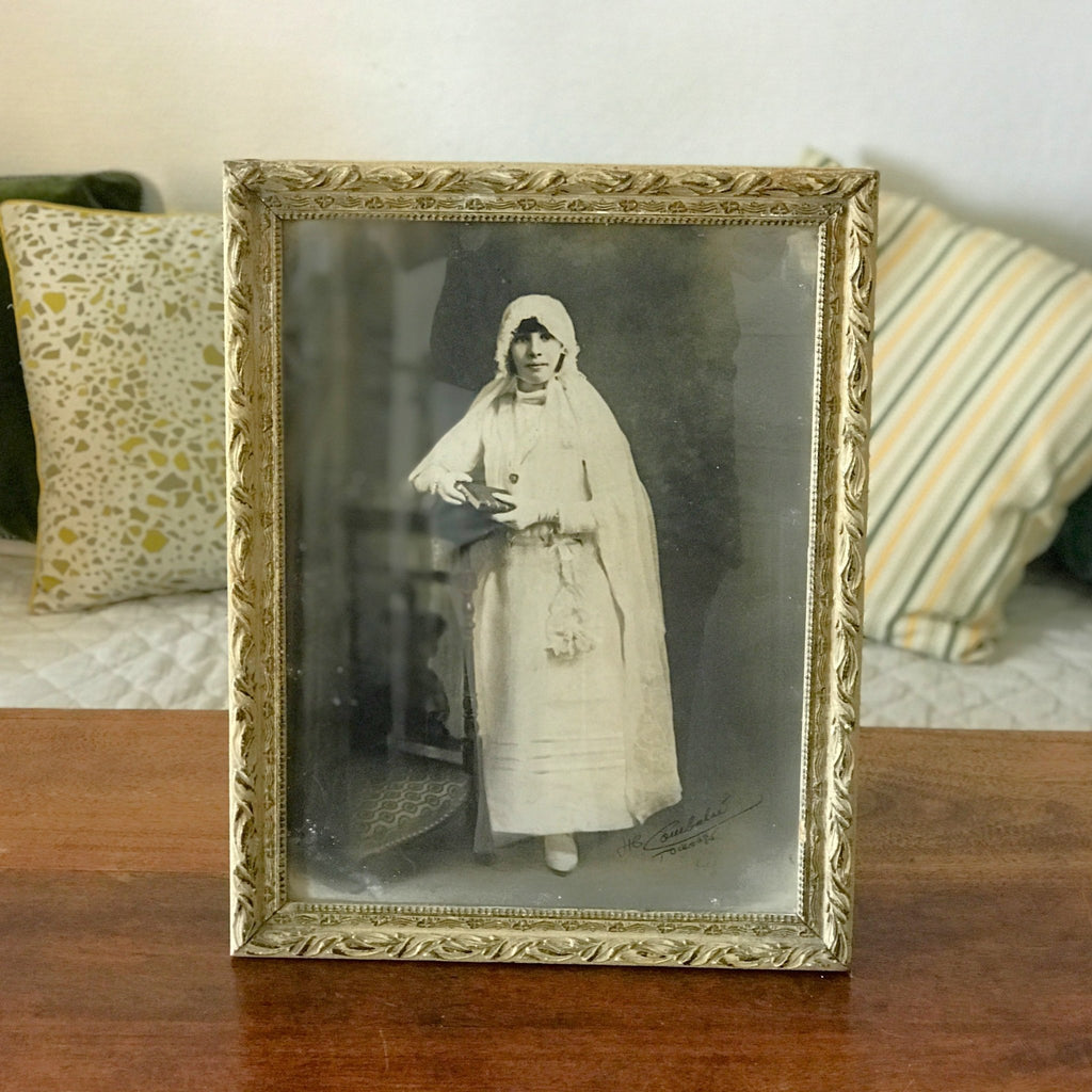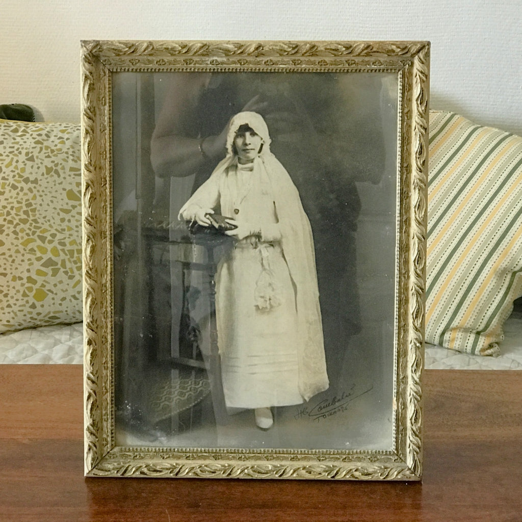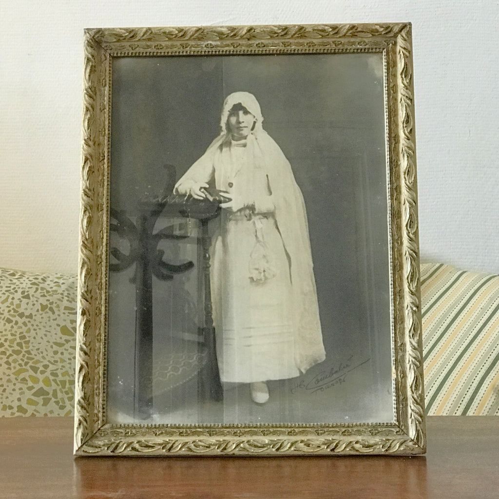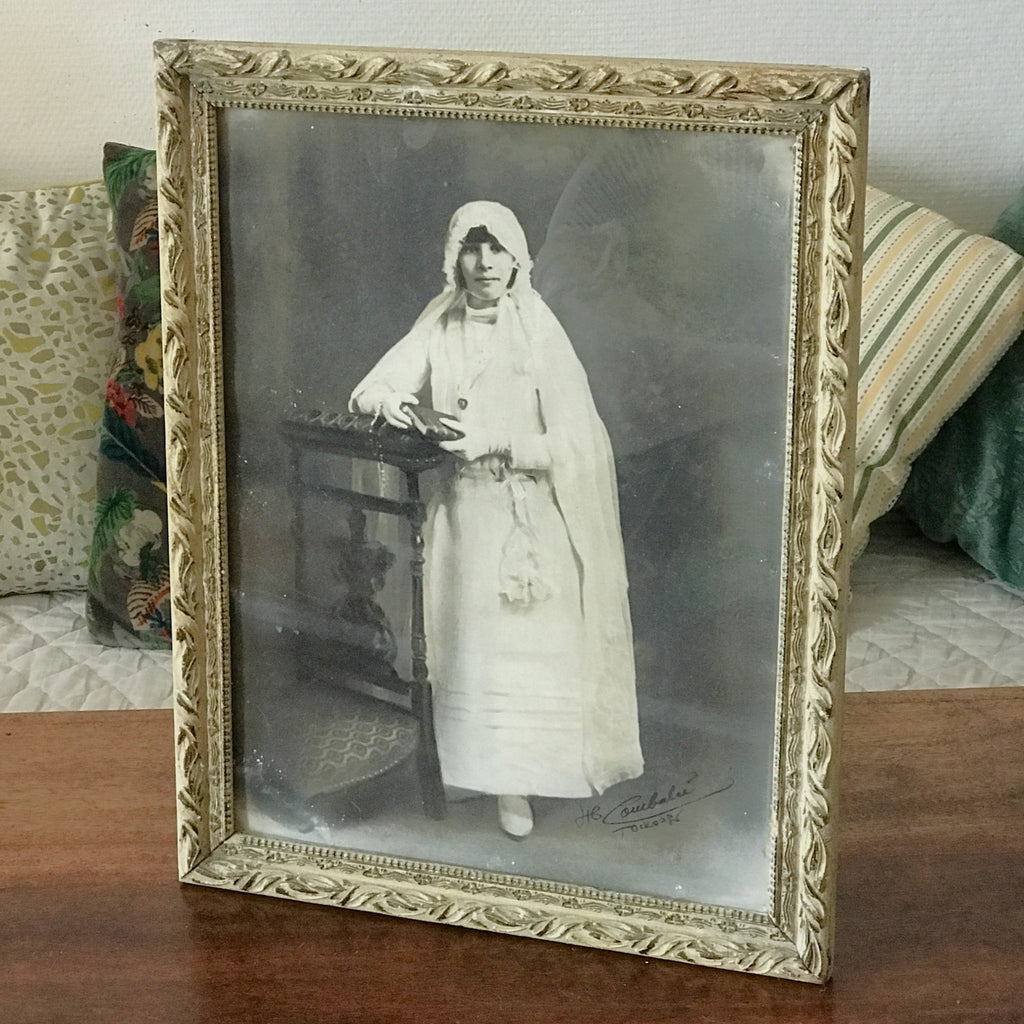 / Grande photographie en noir et blanc d'une jeune communiante encadrement bois peint blanc Circa 1920