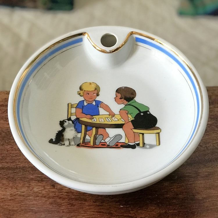Le dessin est typique de ceux des années 30 / 40 et reste tout à fait charmant malgré ses manques soulignés dans les photos. Pratique, il suffit de verser de l'eau chaude dans le trou afin de chauffer l'assiette et la maintenir au chaud pendant que bébé mange. Ne pas laisser sans surveillance