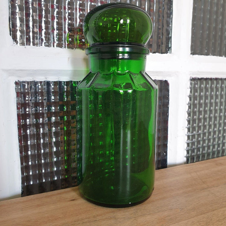 Le bouchon fait penser à un ancien pot d'apothicaire et l'épaule est décorée de côtes plates. Dimensions : hauteur de 21 cm, diamètre de 8,5 cm.