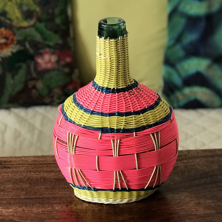 Ultra vintage, elle est tout droit sortie d'un film psychédélique avec son décor rose fluo, jaune et bleu souligné de détails blancs. La dame-jeanne en dessous est d'une capacité de 2 litres et de marque Valenva.