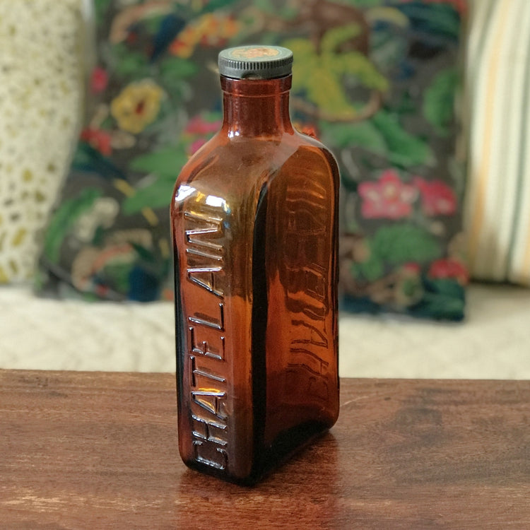 / Grand flacon de médicament en verre moulé ambré des Laboratoires J.L. Châtelain