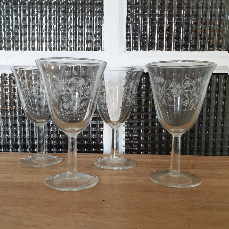 / Lot de 4 verres à vin sur pied forme tulipe motifs volutes et croix