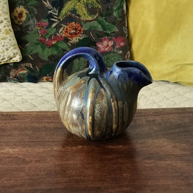 / Pichet en grès semi-émaillé bleu en forme de citrouille ou de melon