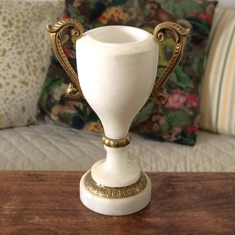 Fait aussi penser à une amphore, cette lampe de table à poser a été électrifiée il y a déjà quelques décennies. Deux frises en bronze doré viennent également rythmer le pied et le socle. La transparence et la blancheur de la pierre permettent également de mettre une ampoule d'une autre couleur pour diffuser une lumière originale.