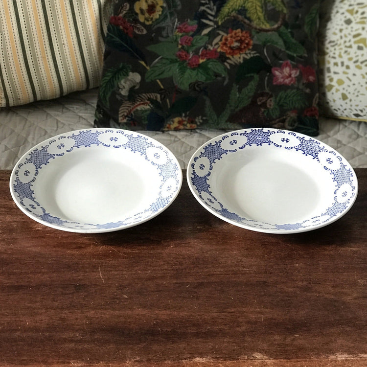 / Paire d'assiettes plates en faïence blanche décor bleu sur la bordure