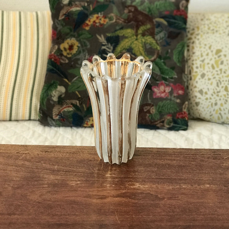 Il est tout en délicatesse avec sa forme évasée, son bord crénelé, sa paroi granitée ou dorée et ses motifs en relief.