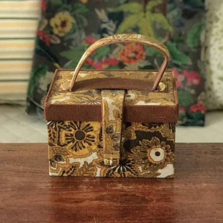 Vous voulez de l'originalité et du rétro ? En voici avec cet ancien coffret à chocolats tout droit venu d'Espagne, et oui ! Munie d'une poignée et d'une languette avec un système de fermeture, elle est entièrement recouverte d'un tissu fleuri dans les tons jaune moutarde, beige et marrons.
