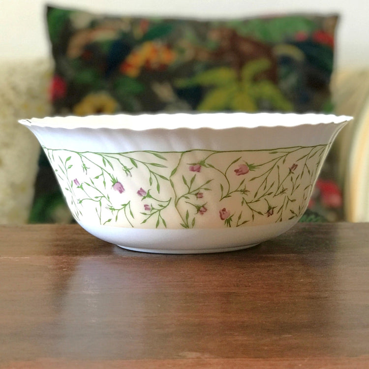 / Saladier Luminarc verre opalin blanc décor fleurs mauves sur fond jaune pâle petits défauts