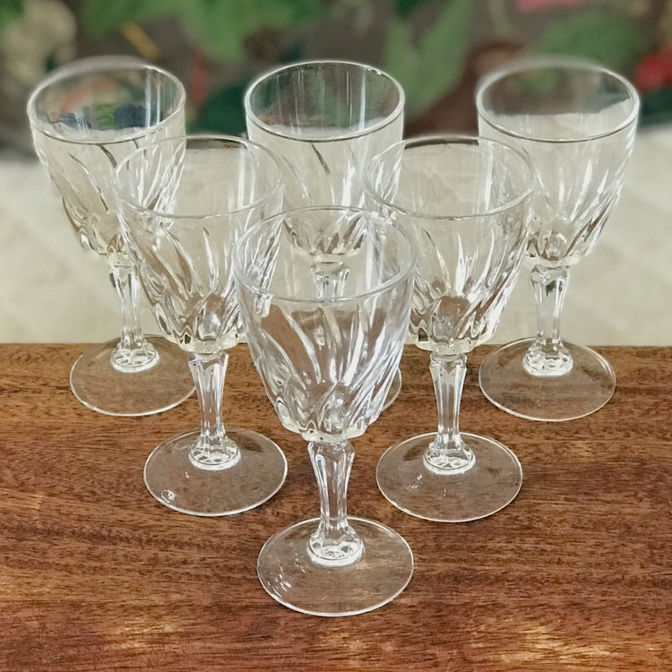 / Lot de 6 verres à liqueur sur pied en cristal décor gravé attribution Cristal d'Arques modèle Flamenco