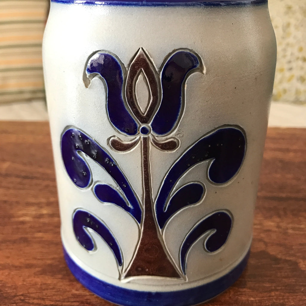 / Chope pichet à bière en grès gris, décor bleu cobalt et marron et couvercle en étain