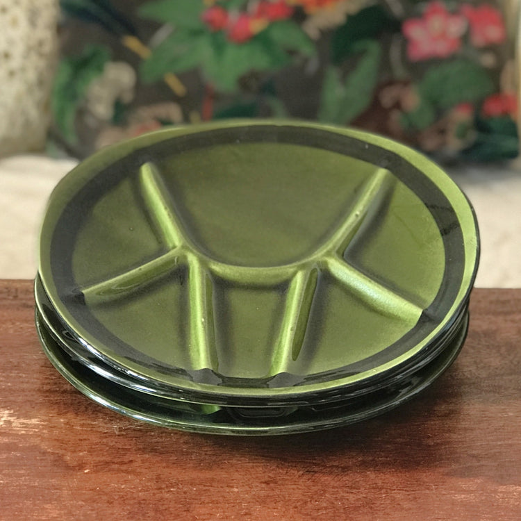 / Lot de 3 assiettes à fondue Niderviller émaillé vert kaki bordure noire