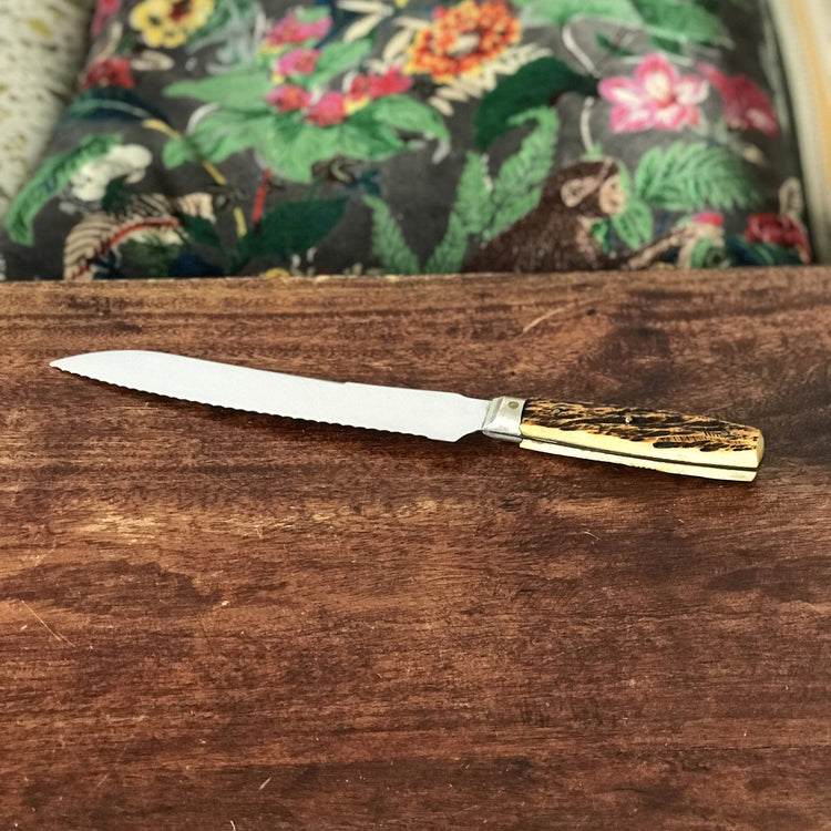 Il est très élégant avec son manche texturé à la couleur variable. Sur un côté de la lame vers le centre, nous devinons le mot Inox mais impossible de lire la marque au-dessus. Le couteau est en bon état. Longueur totale de 31 cm.